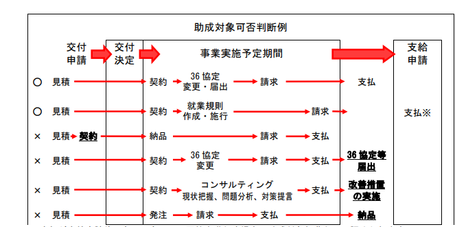 当該年度の1月30日又は交付申請時に記載した計画期間までに成果目標の実施を行い、機器の導入をしなければなりません。また、賃上げ加算を目標を掲げている事業者様は賃上げを実施期間に行い1箇月以上実際に支払う必要があります。