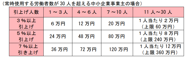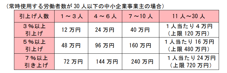 (例)労働者が30人未満の事業者において、交付申請時において賃上げ対象者の記載し、5%以上の賃上げを行い支払いを行った場合は48万円の助成額の加算が行われます。