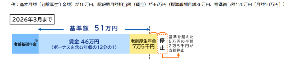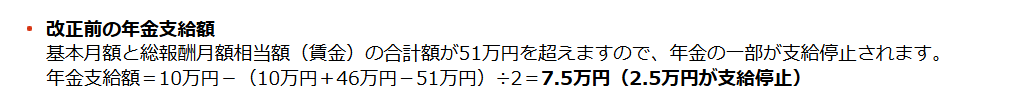 仕組み ①老齢厚生年金額+総報酬月額相当額≦51万⇒年金の支給停止は0