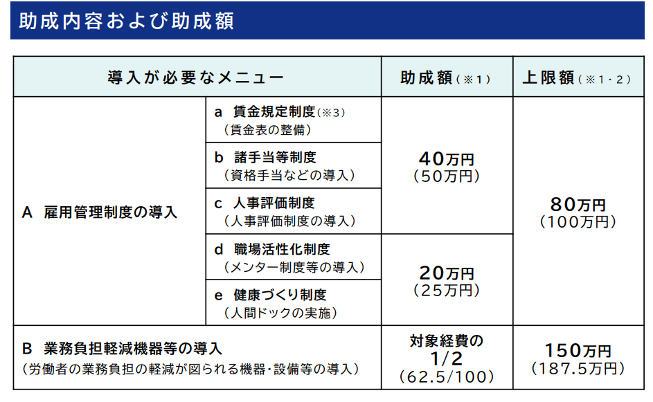 人材確保等支援助成金は、人材の定着や職場環境の改善に取り組む離職率を低下させる事業主を支援する制度です。雇用管理コースでは、人事評価制度の導入、諸手当等制度の導入、賃金規程の導入、職場活性化制度の導入の実施、雇用環境整備助成コースでは従業員の作業負担を軽減する機器等の導入し、雇用環境の改善などを計画的に実施し、離職率の低下などの成果が認められた場合に助成金が支給されます。