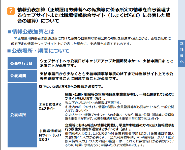 ①正社員化コースで情報公表した場合、20万円(大企業は15万)加算されます