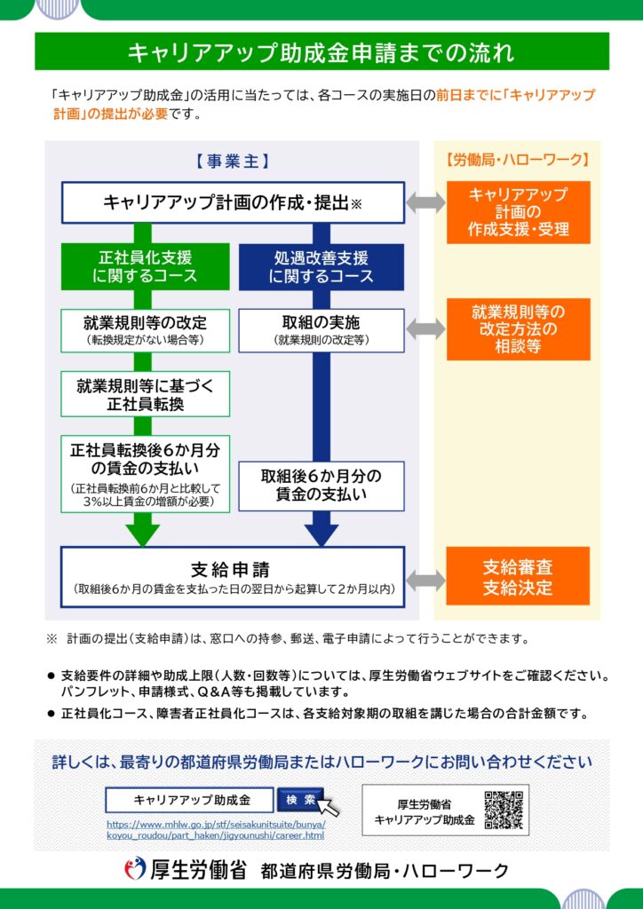 1. キャリアアップ計画の作成・届出: 取組を実施する前に、管轄の労働局に計画書を届出しチェックを受ける必要があります。